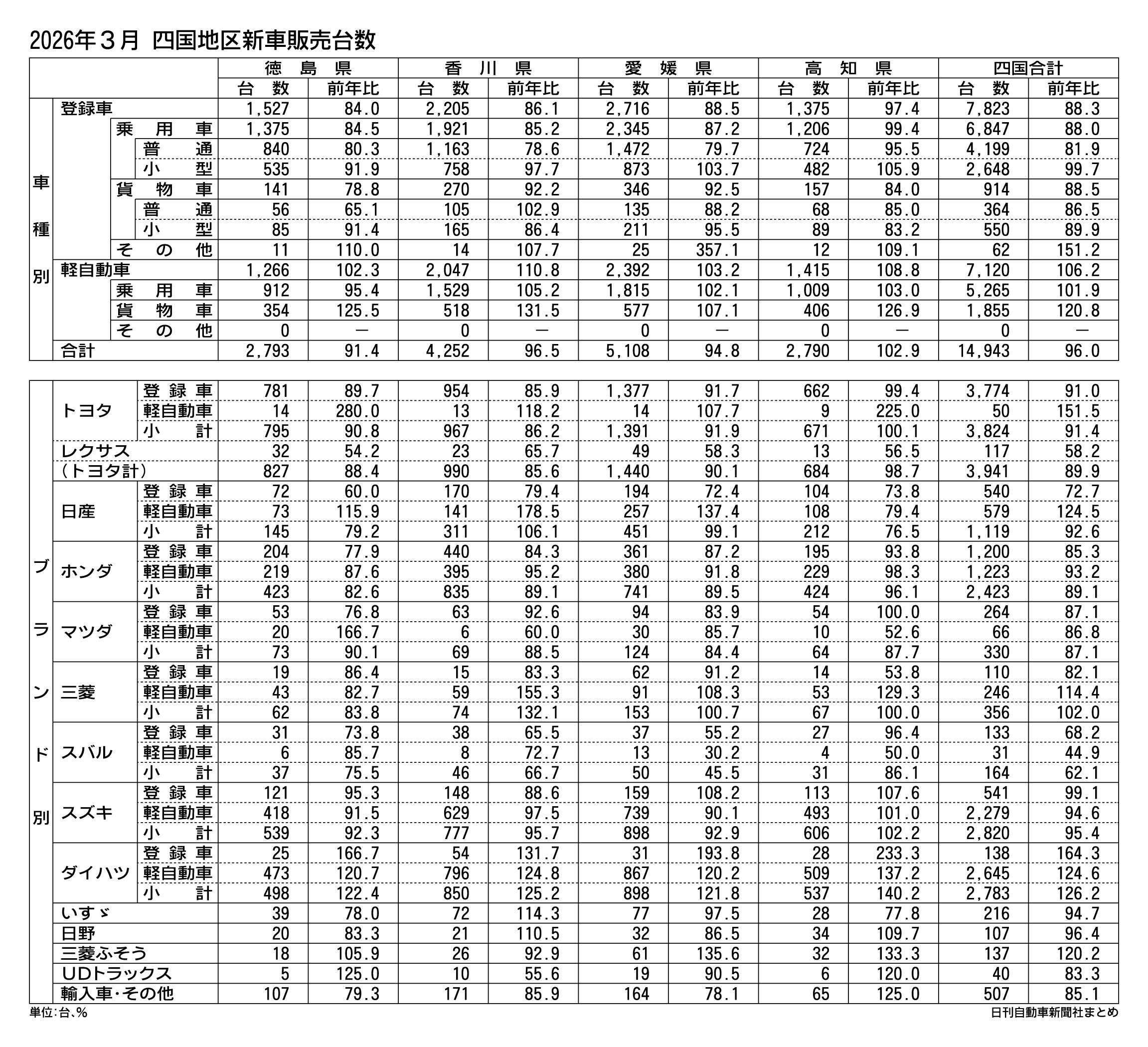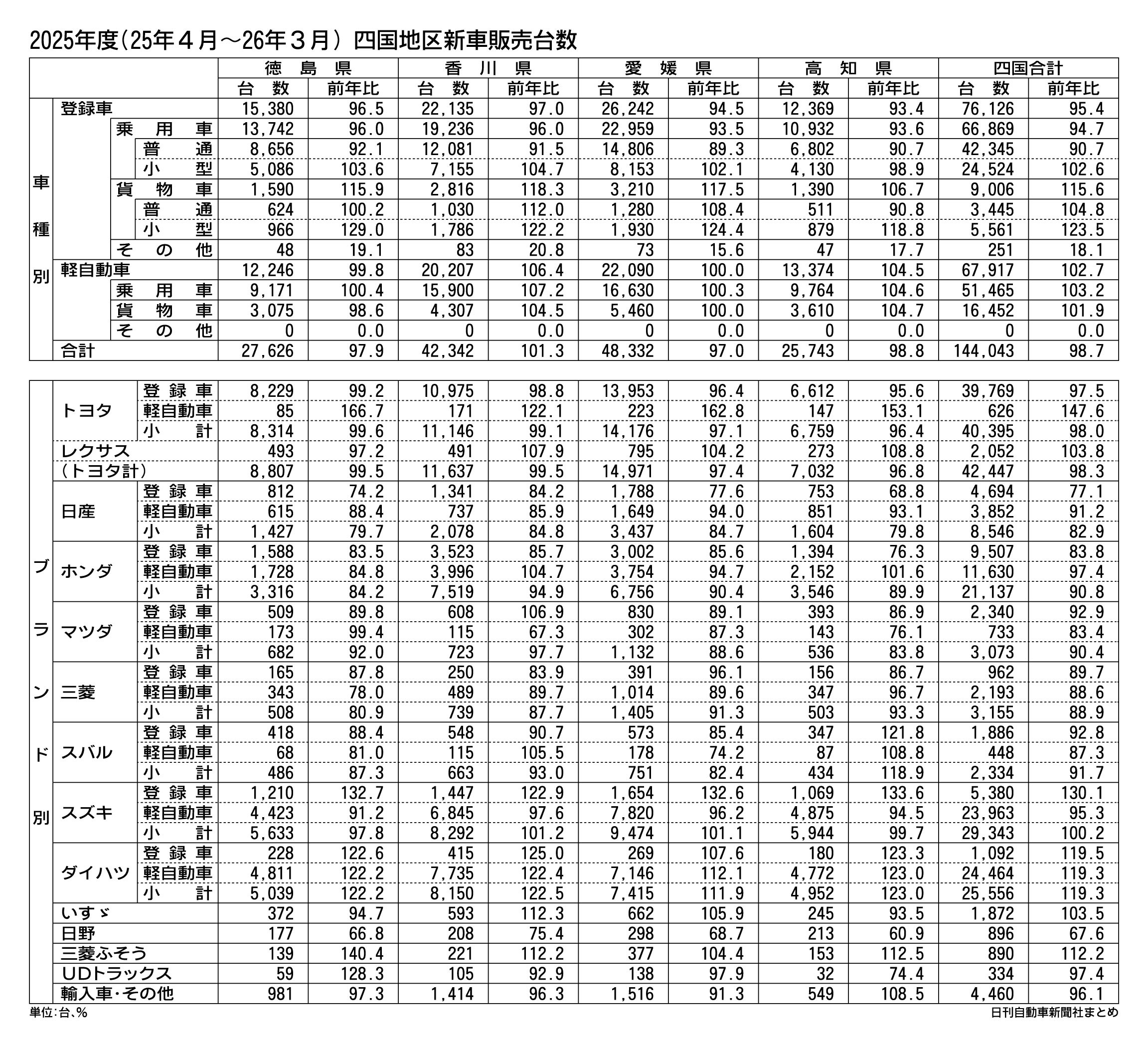 四国地区の2025年度(4月~26年3月)の新車販売台数(登録車と軽自動車の合計)は、前年度比1.3%減の14万4043台で、4年ぶりのマイナスになった。上期(25年4~9月)は6万8800台で前年同期実績を1.0%上回ったが、下期(25年...