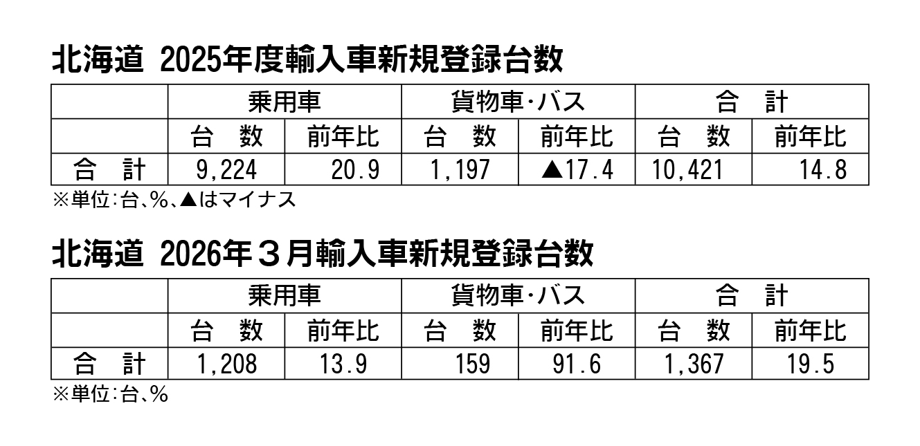 日本自動車輸入組合(JAIA)の発表によると、2025年度(25年4月~26年3月)の道内輸入車新規登録台数(外国メーカー車と日本メーカー車)は前年度比14.8%増の1万421台で、2年ぶりのプラスだった。乗用車は同20.9%増の9224台...