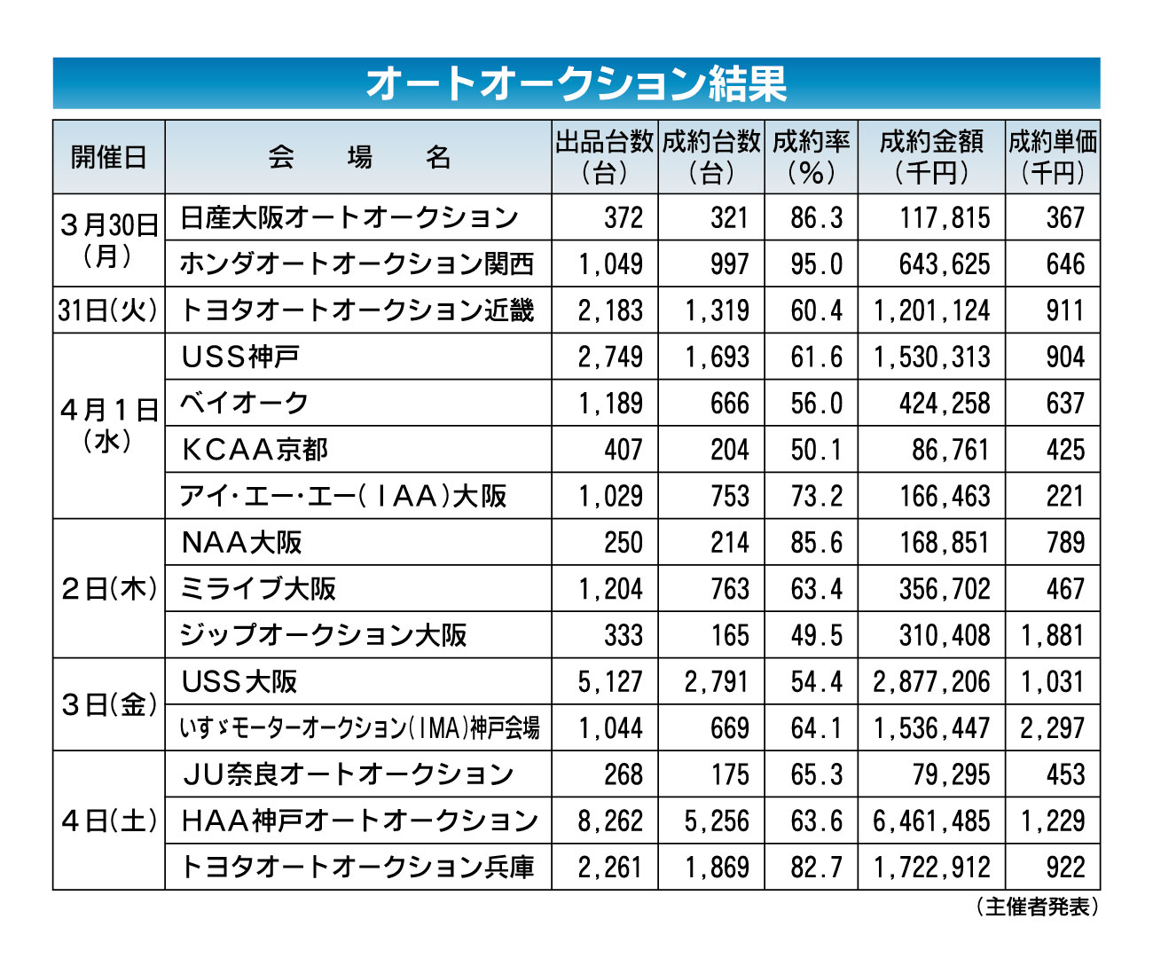 〈オートオークション結果〉近畿地区 2026/3/30~4/4