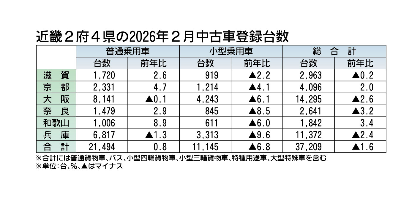 近畿2府4県の2月の中古車登録実績(軽自動車を除く)がまとまった。新規・移転・変更手続きを合算した登録台数は前年同月比1.6%減の3万7209台で、2カ月連続のマイナス。府県別では和歌山と京都でプラスとなった。全体の9割近くを占める乗用車の...