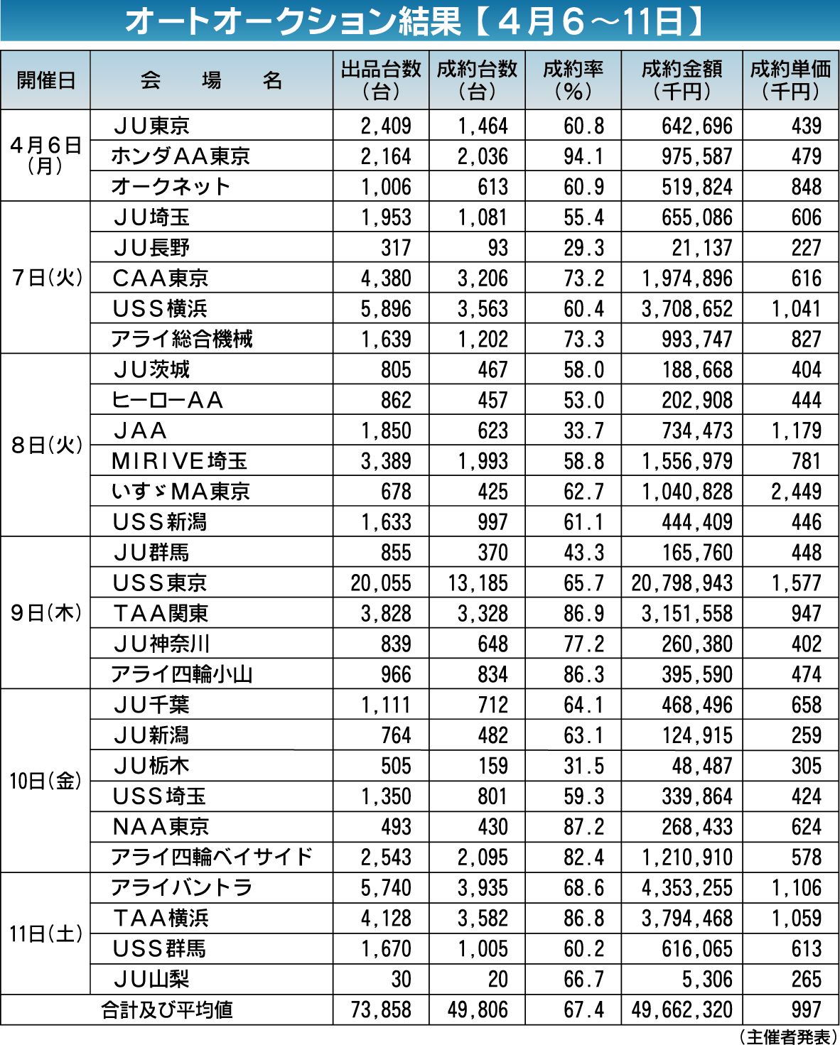 〈オートオークション結果〉首都圏 2026/4/6~4/11