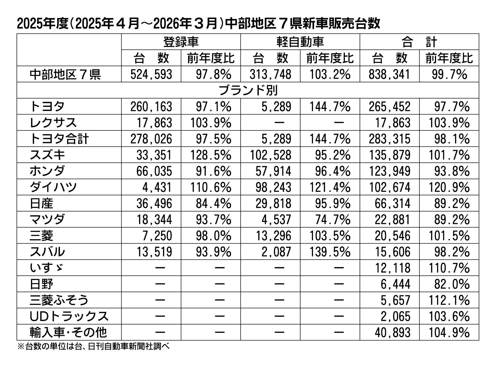 日刊自動車新聞社がまとめた2025年度の中部地区7県の新車販売台数は、前年度比0.3%減の83万8341台だった。登録車が同2.2%減の52万4593台で、全県で前年割れした。一方、軽自動車は同3.2%増の31万3748台となり、全県で増加...
