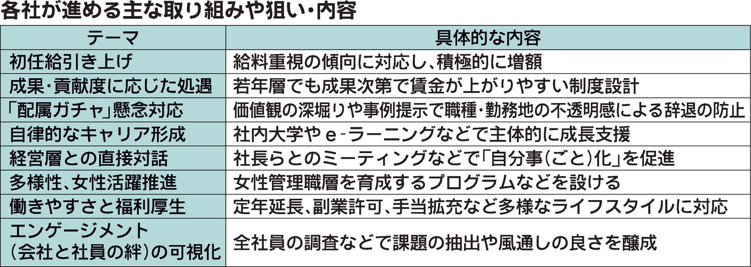 待遇引き上げや人事制度見直し 各社の採用戦略には、若手の意欲に応えようとする動きがはっきりと表れている。待遇の引き上げや人事制度の見直しが、その中心だ。 目立つのが初任給の大幅な引き上げ。各社が相次いで水準を引き上げている。年齢や年次に関...