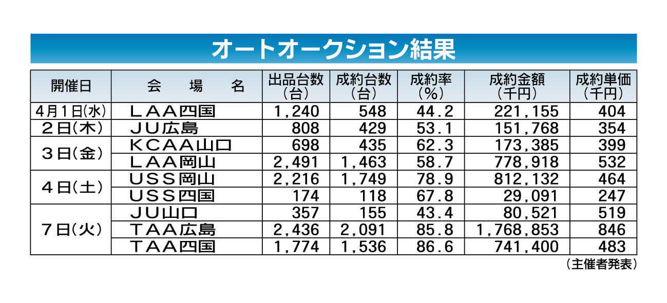 〈オートオークション結果〉中・四国地区 2026/4/1~7