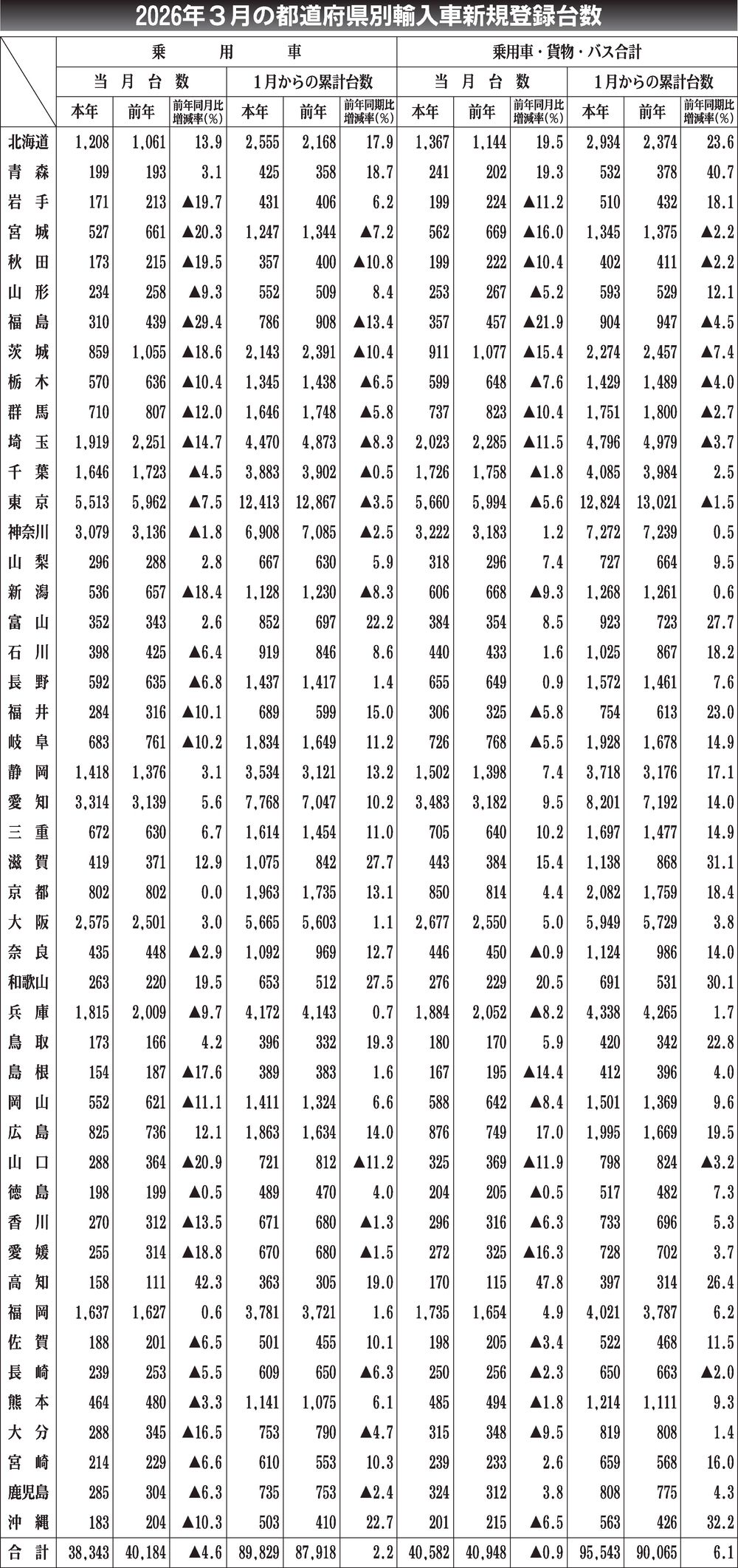 〈2026年3月の都道府県別輸入車新規登録台数〉