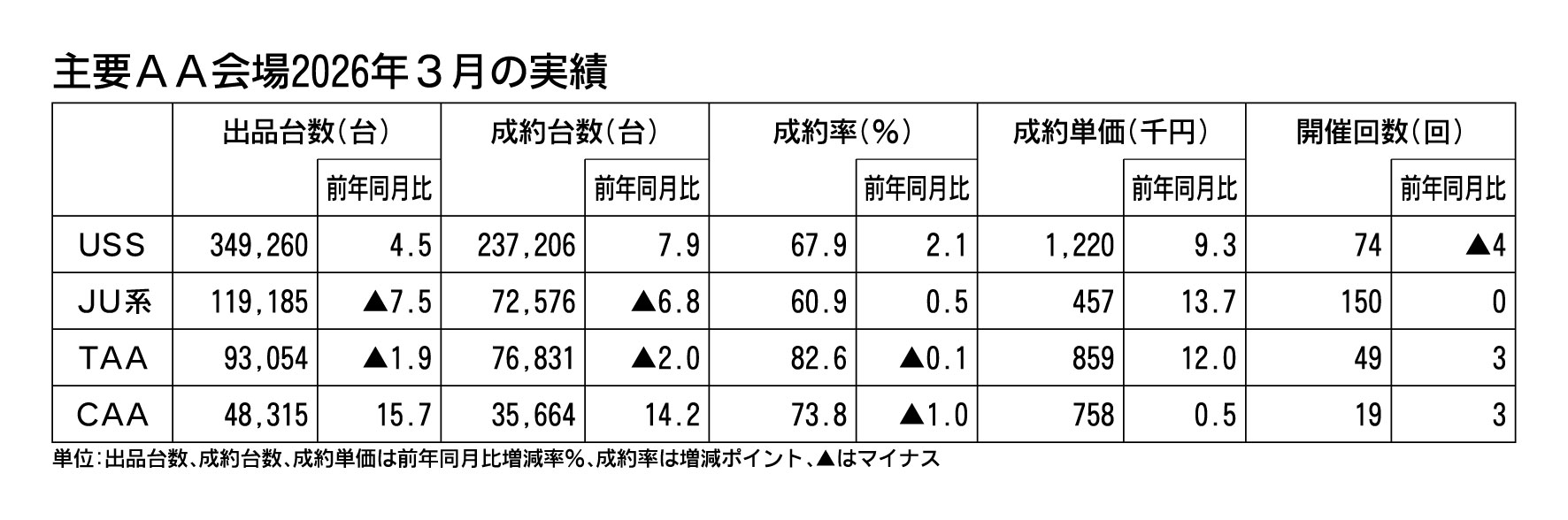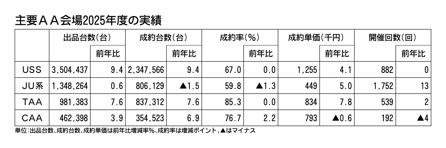 中古車オークション(AA)の主要4事業者が発表した2025年度実績は、ユー・エス・エス(USS)など3事業者の平均成約単価が過去最高となった。上期(25年4~9月)は2事業者がマイナスだったものの、下期(同10月~26年3月)は全事業者がプ...
