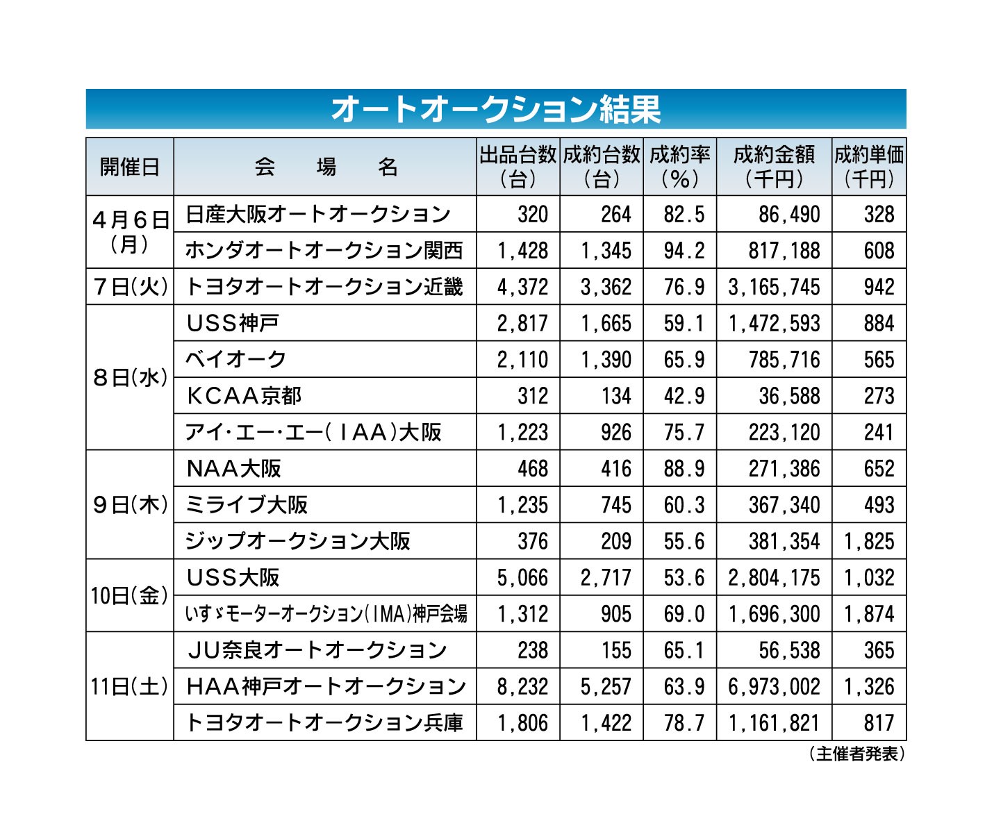 〈オートオークション結果〉近畿地区 2026/4/6~11