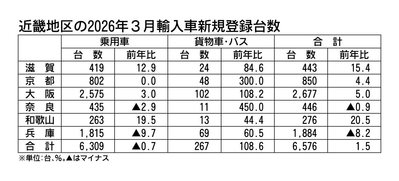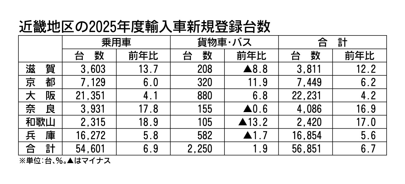 日本自動車輸入組合(JAIA)の発表によると、2025年度(25年4月~26年3月)の近畿地区の輸入車新規登録台数(外国メーカー車と日本メーカー車)は、前年度比6.7%増の5万6851台と2年連続でプラスだった。外国メーカー車は微増で推移し...