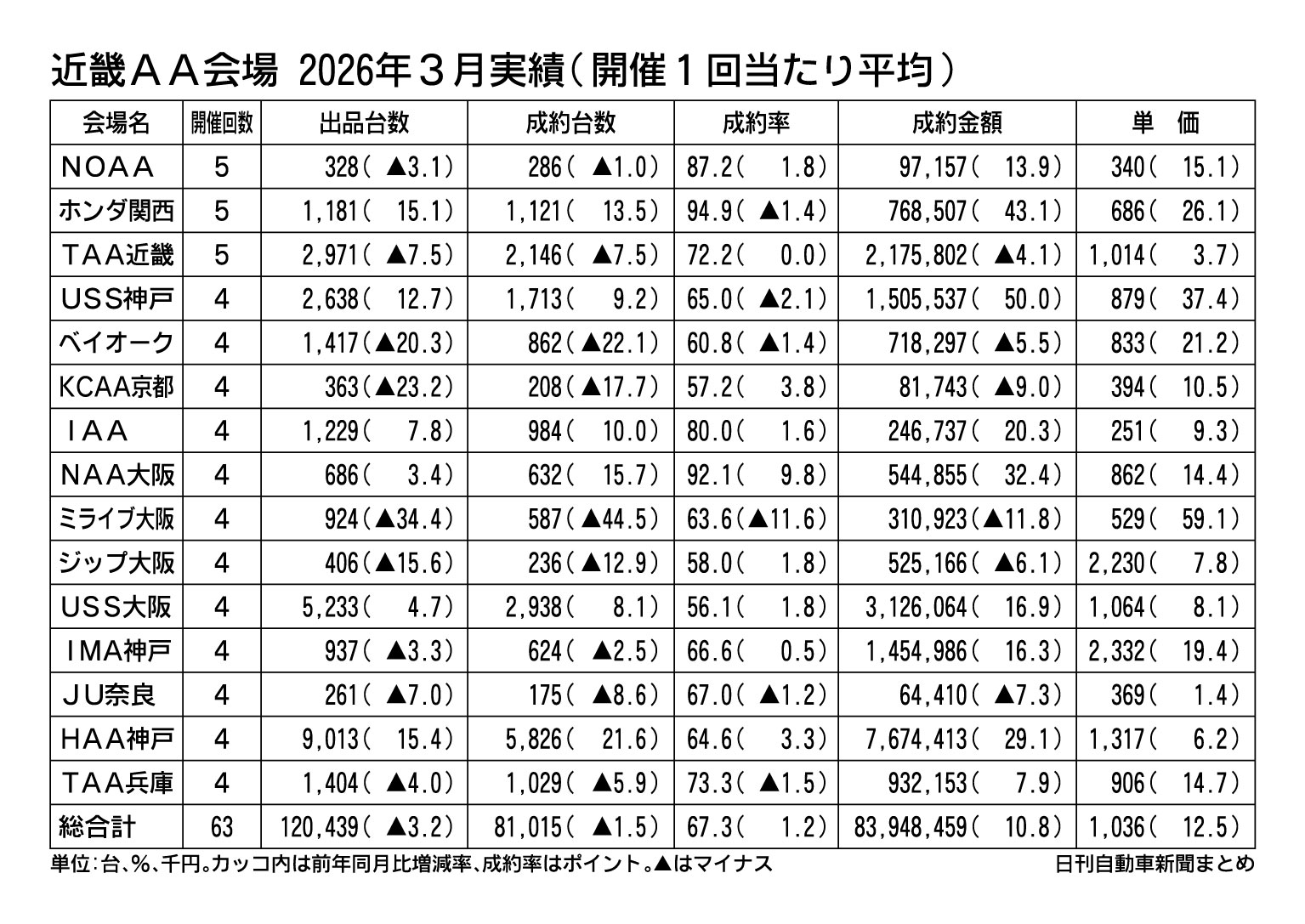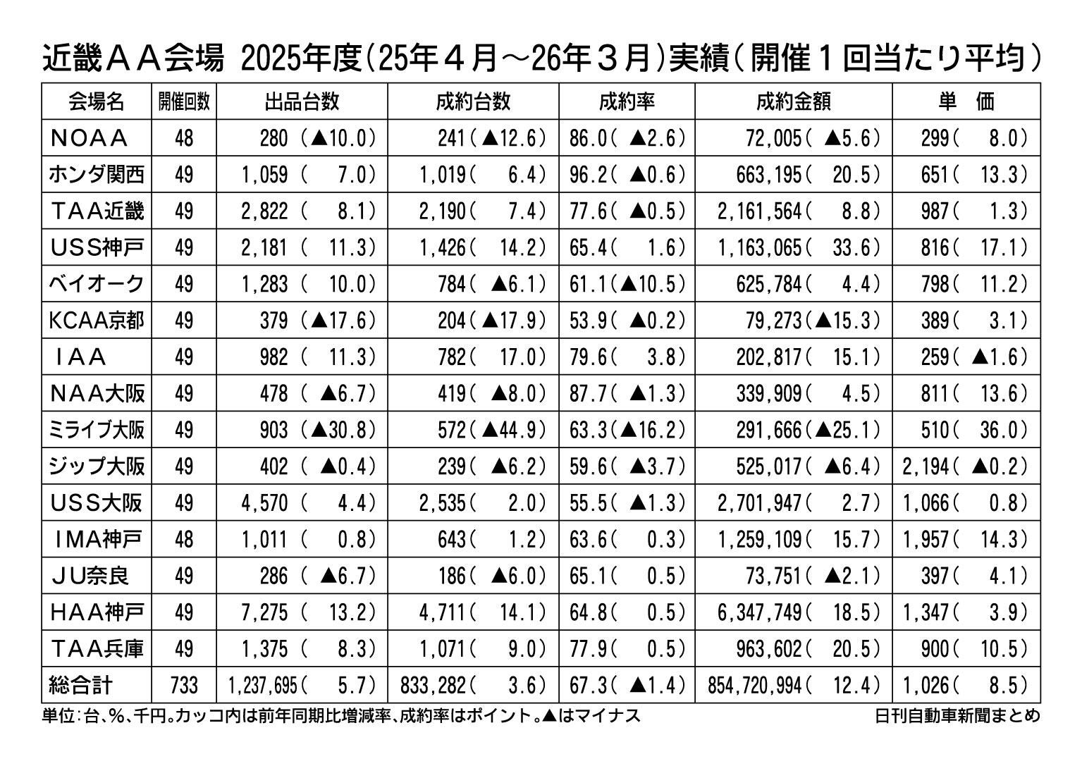 日刊自動車新聞は、近畿地区の中古車オークション(AA)15会場の2025年度(25年4月~26年3月)実績をまとめた。15会場の開催回数の合計は、前年度と同じ733回。中古車流通量が25年11月までは前年同月を超えていたことから、出品台数は...