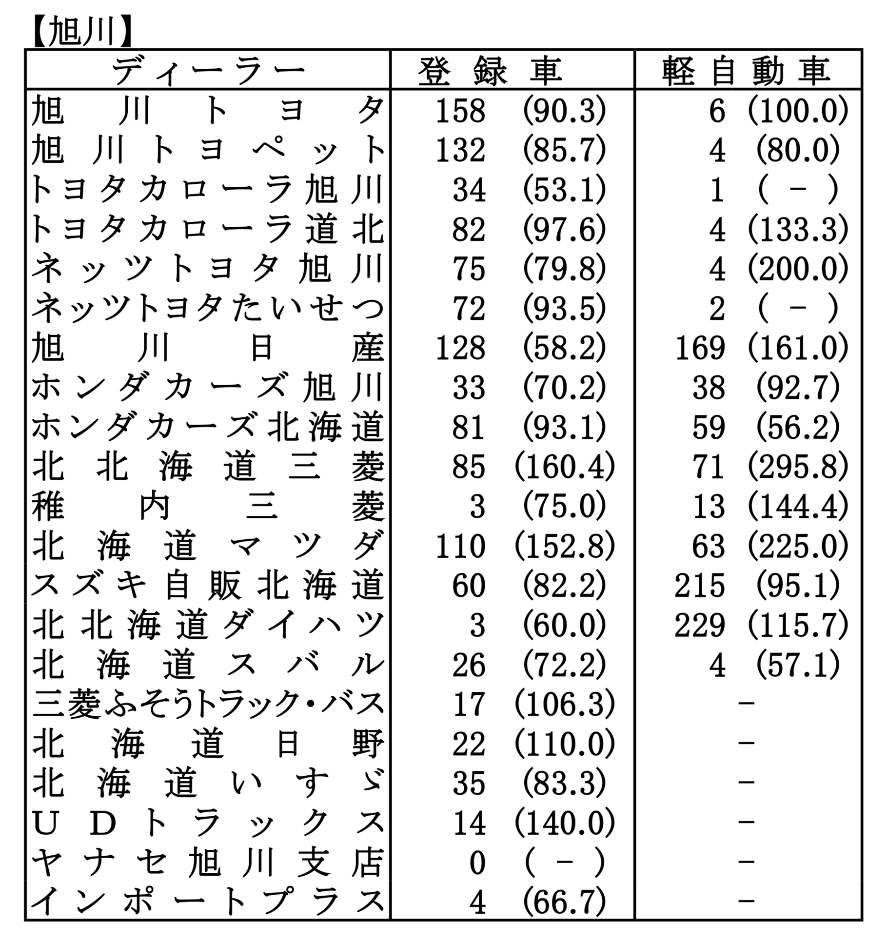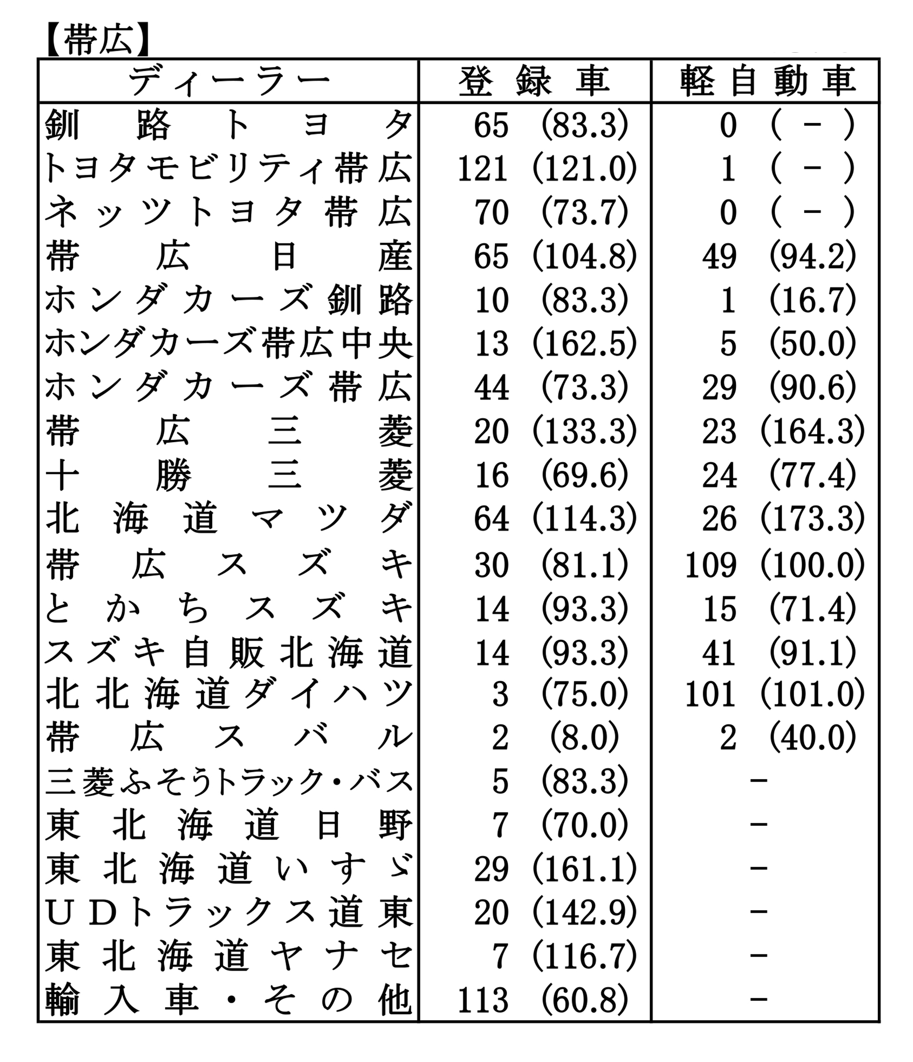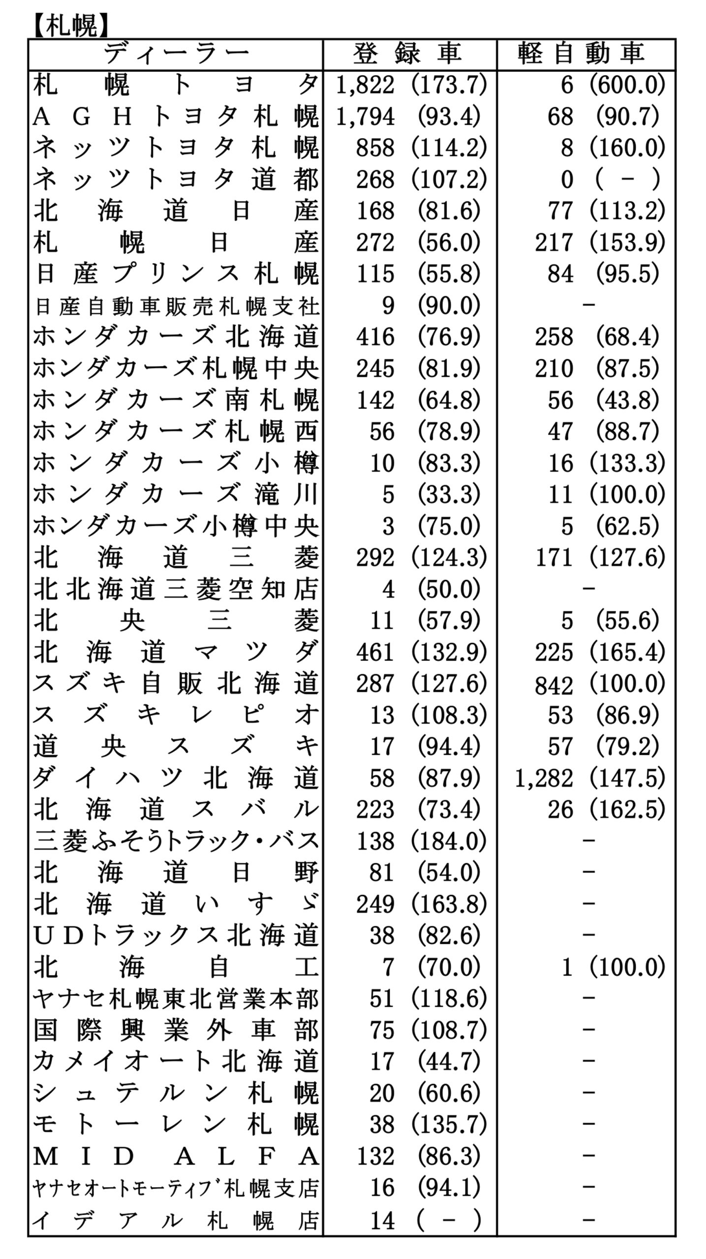 〈2026年3月度全道管内別ディーラー別新車登録・届け出台数(カッコ内は前年同月比)〉※札幌管内ホンダ系・スズキ系の登録台数は自販連正会員分