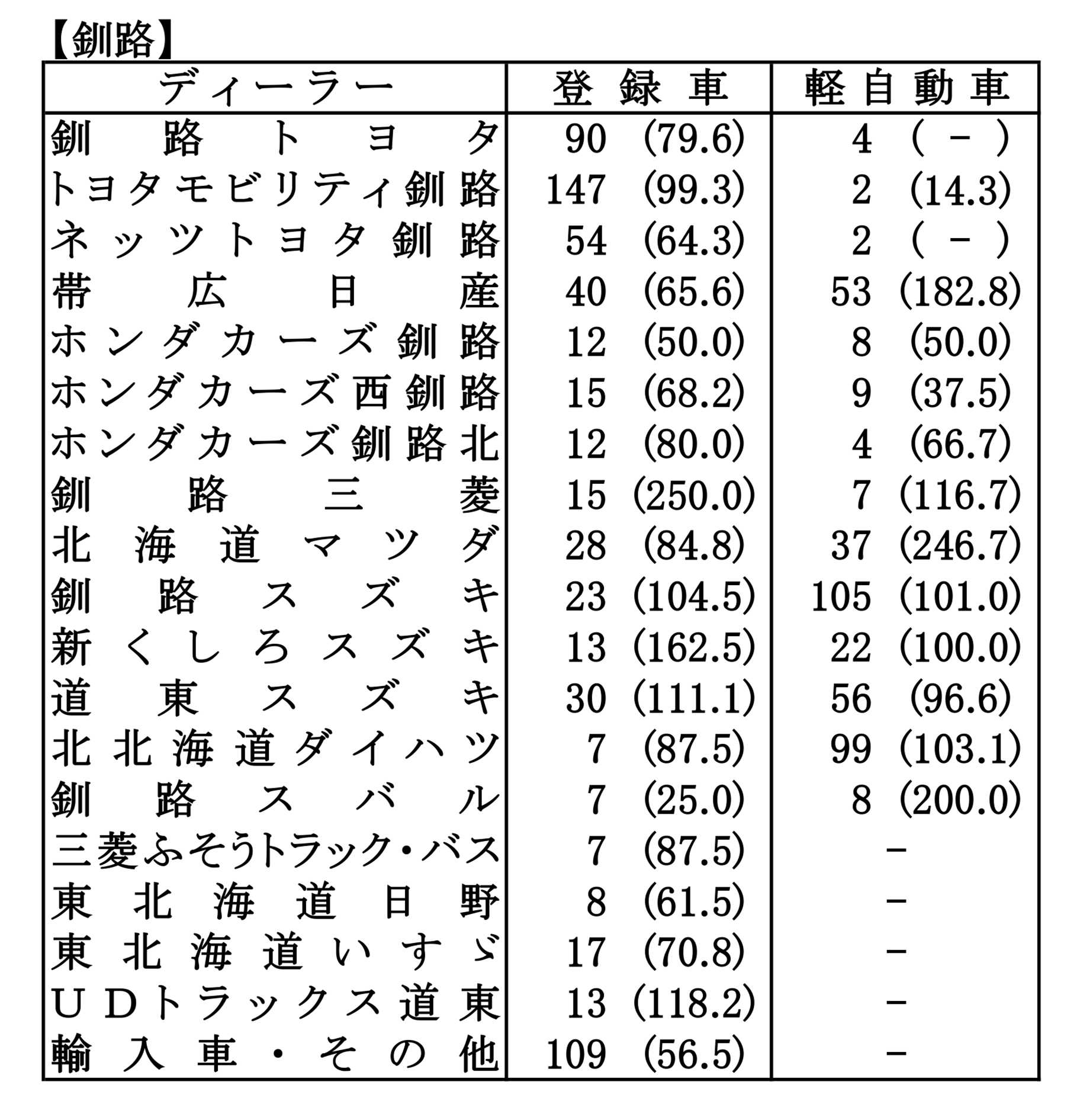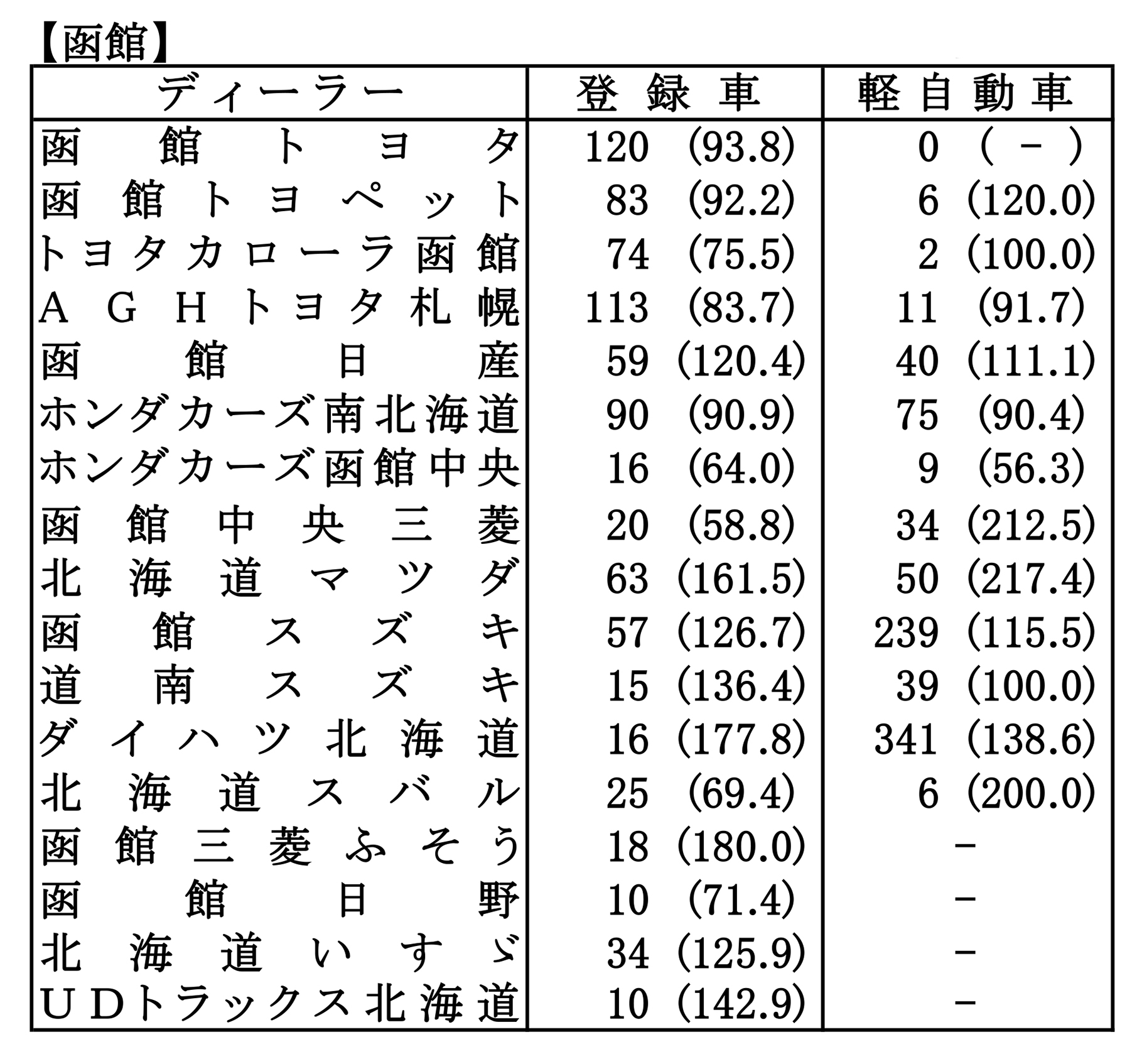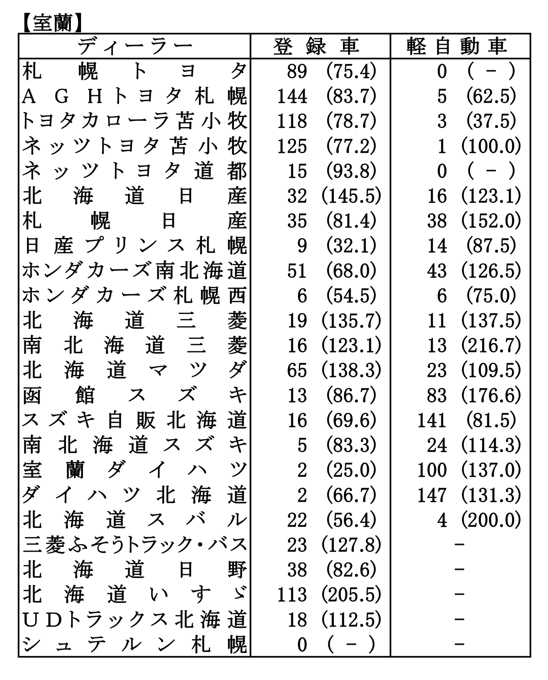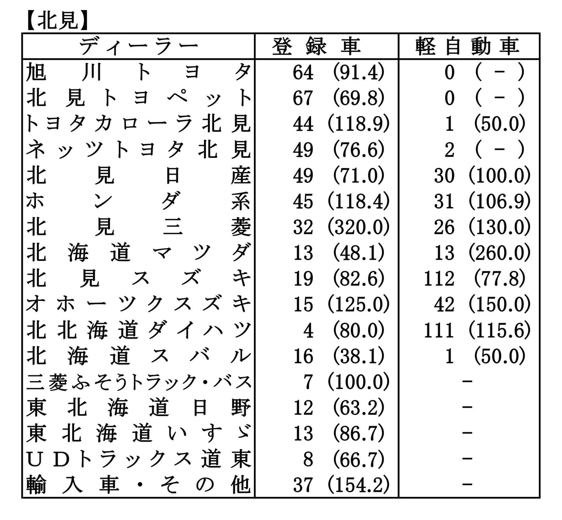 〈2026年3月度全道管内別ディーラー別新車登録・届け出台数(カッコ内は前年同月比)〉※札幌管内ホンダ系・スズキ系の登録台数は自販連正会員分