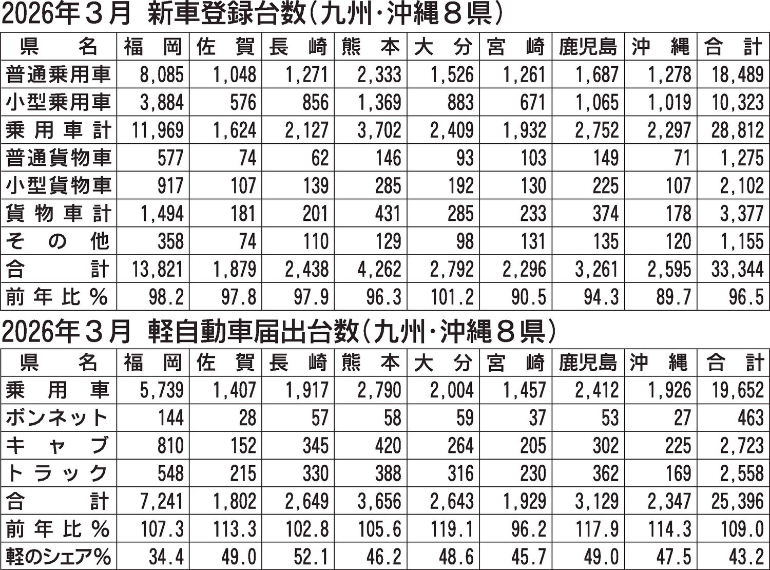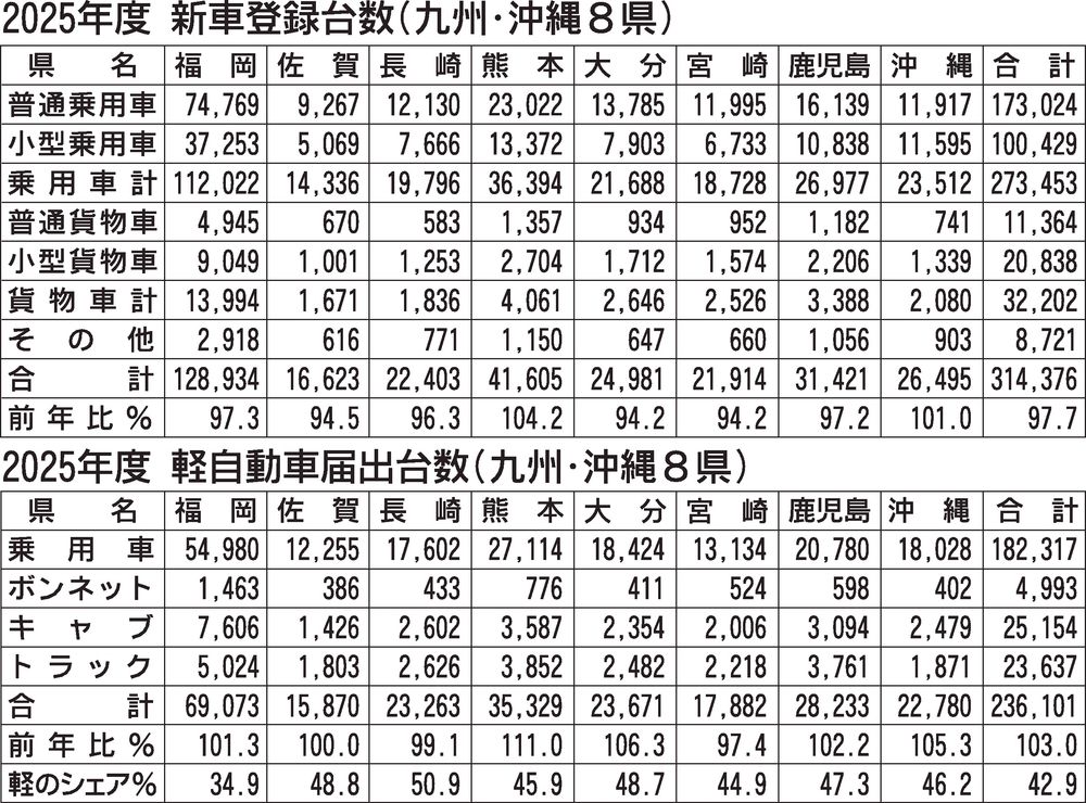 九州・沖縄地区2025年度(同年4月~26年3月)の新車販売台数(登録車と軽自動車合計)は、前年比0.1%減の55万477台となり、4年ぶりに前年をわずかに下回った。ただ、減少率は全国平均より0.8ポイント小さかった。登録車は供給制約の影...