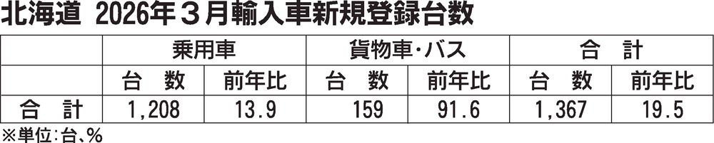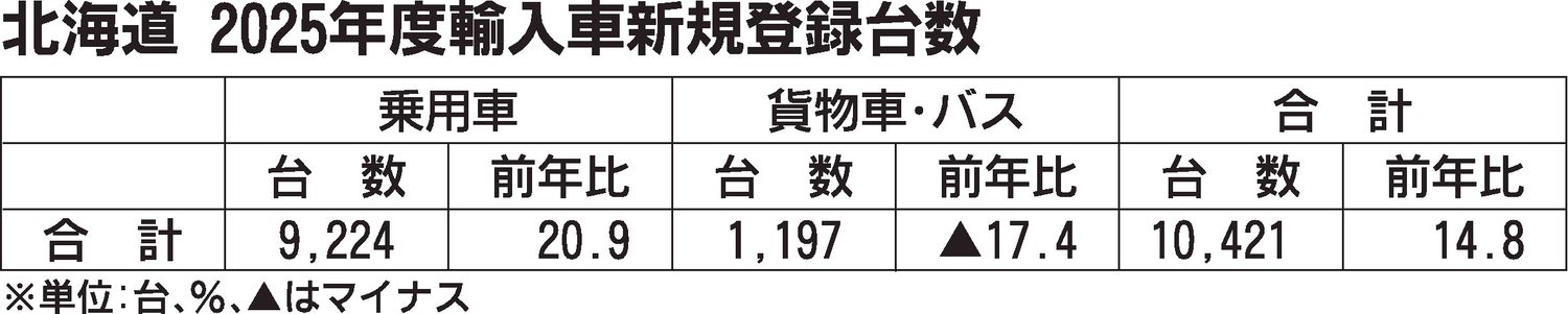 日本自動車輸入組合(JAIA)の発表によると、2025年度(4月~26年3月)の道内輸入車新規登録台数(外国メーカー車と日本メーカー車)は前年度比14.8%増の1万421台で、2年ぶりのプラスだった。乗用車は同20.9%増の9224台で2...