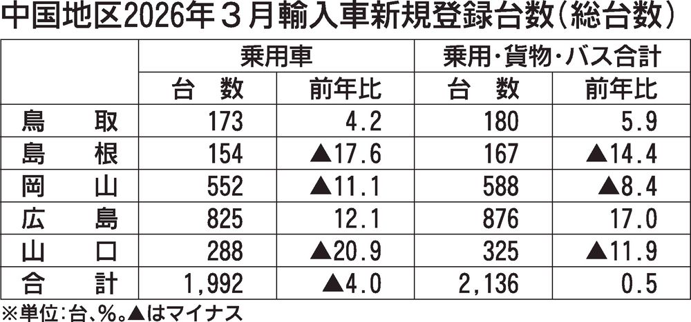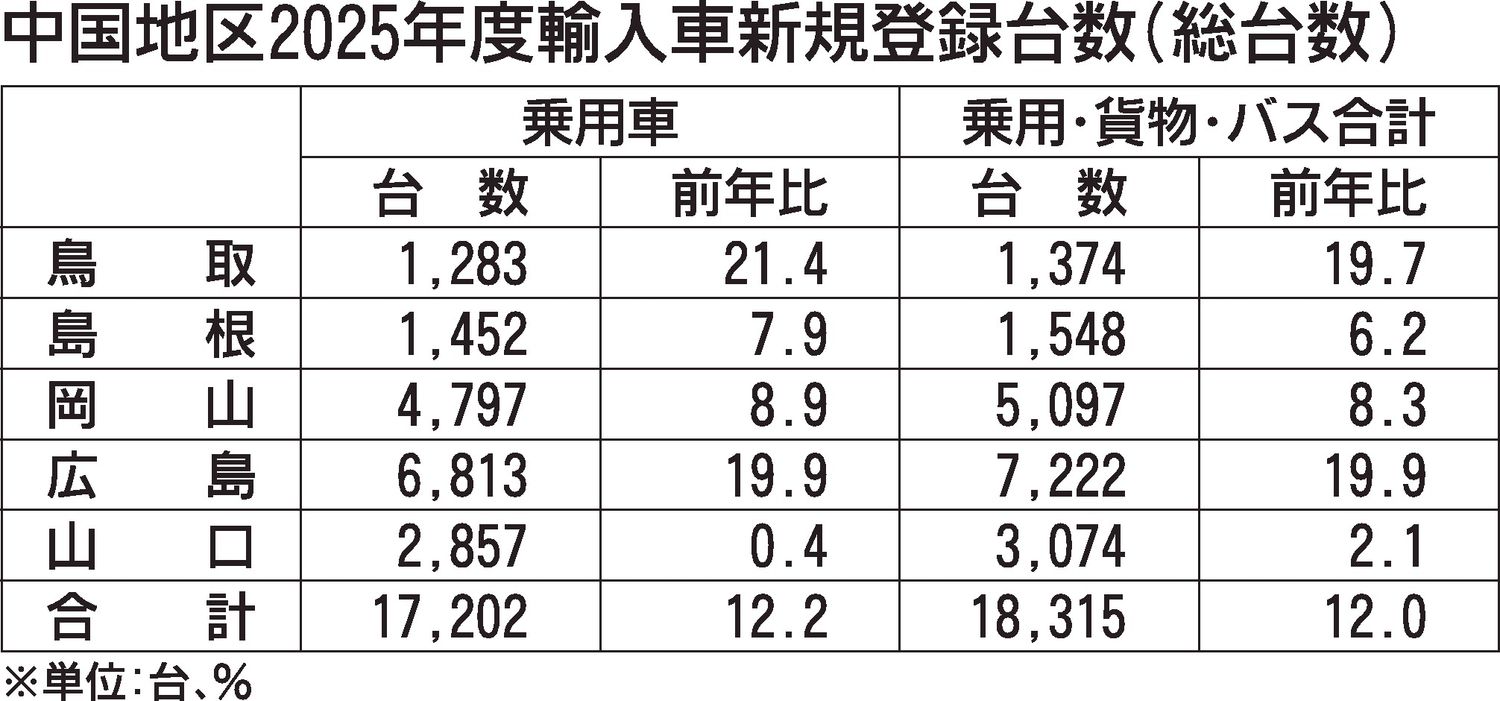 日本自動車輸入組合(JAIA)の発表によると、2025年度(25年4~26年3月)の中国地区の輸入車新規登録台数(外国メーカー車と日本メーカー車の合計)は、前年度比12.0%増の1万8315台で、3年連続で増加した。車種別では乗用車が同1...