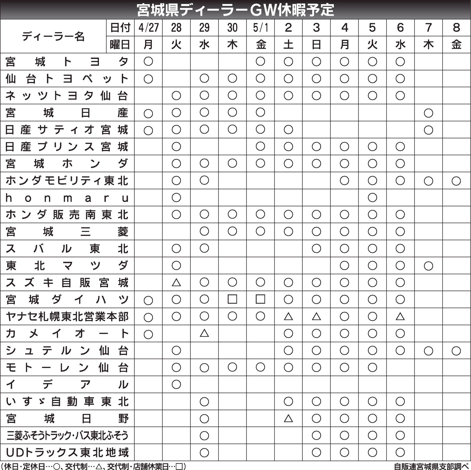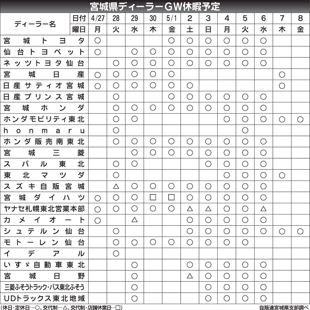 〈宮城県ディーラーGW休暇予定〉