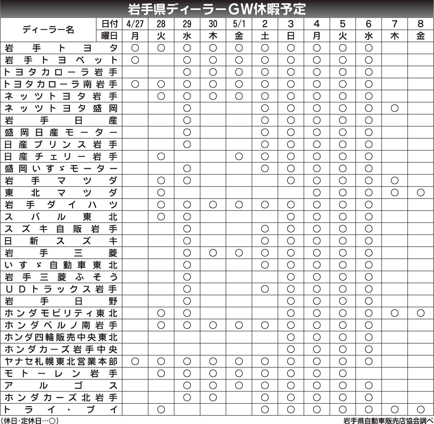 〈岩手県ディーラーGW休暇予定〉