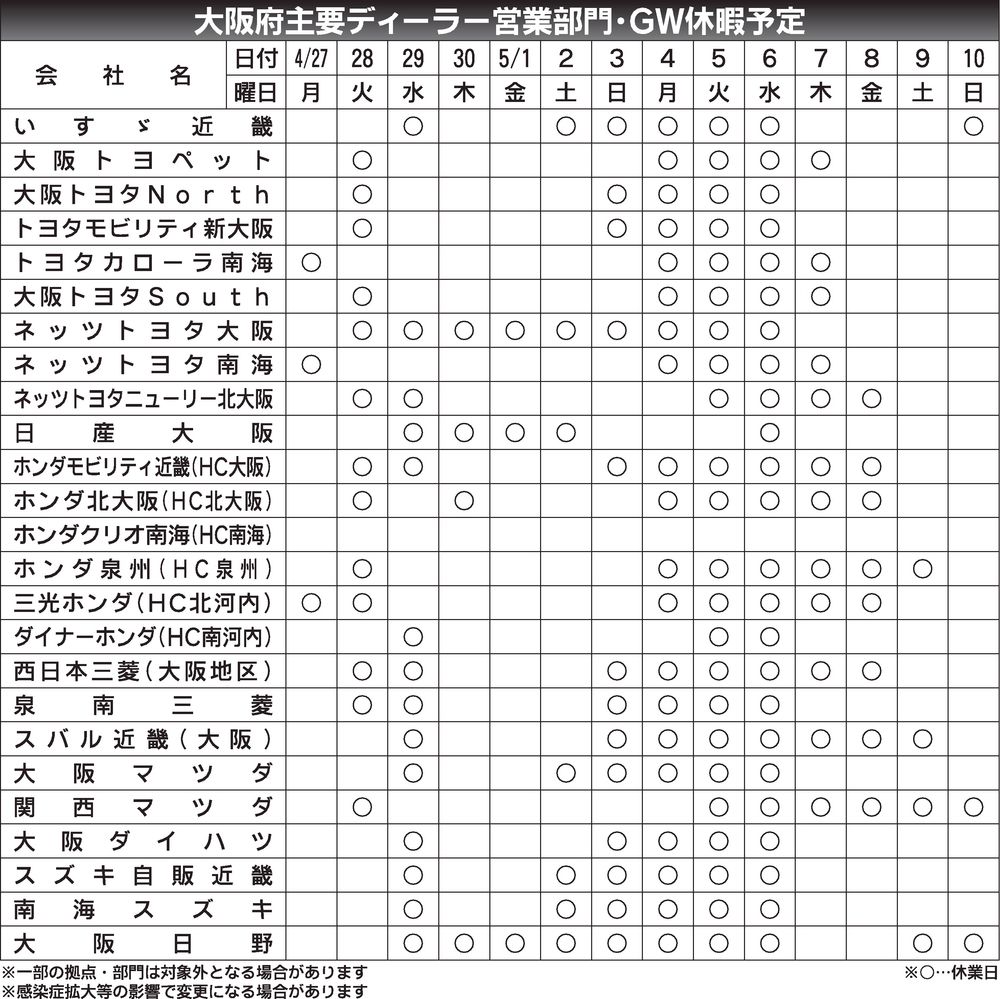 〈大阪府主要ディーラー営業部門GW休暇予定〉