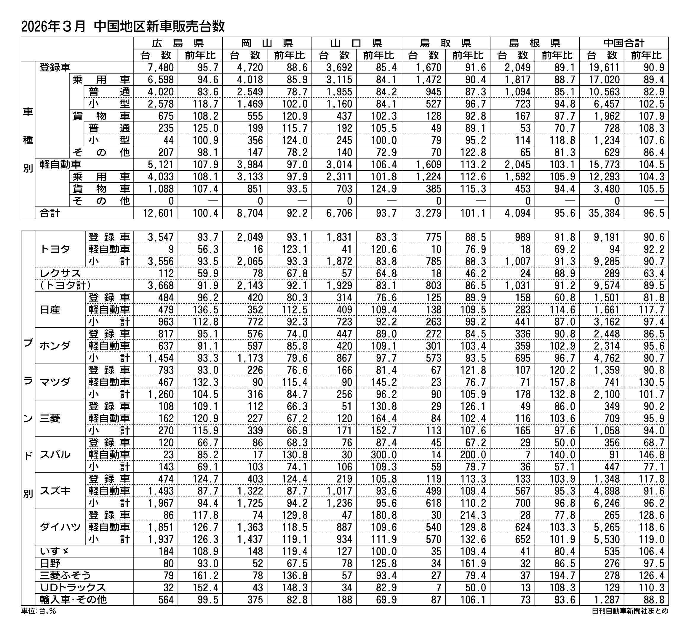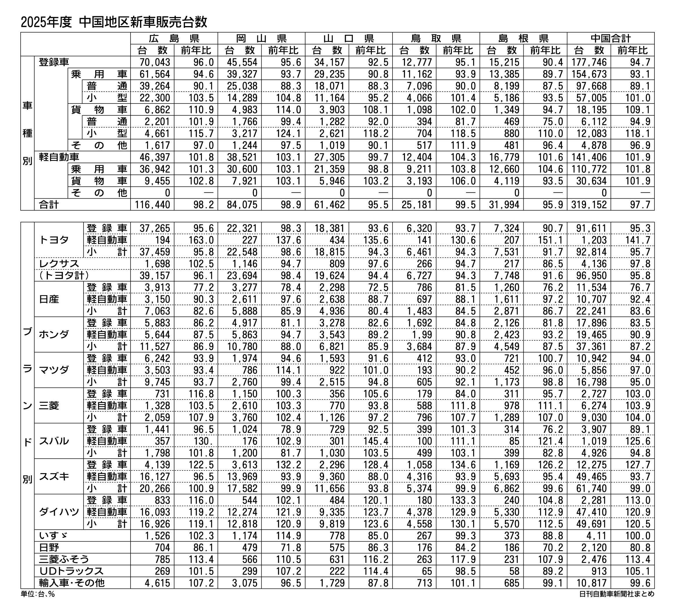 中国地区の2025年度(25年4月~26年3月)新車販売台数(登録車と軽自動車の合計)は、前年度比2.3%減の31万9152台だった。全国市場と同じく4年ぶりに前年を下回り、下げ幅は全国よりも1.4ポイント大きかった。軽自動車が同1.9%増...