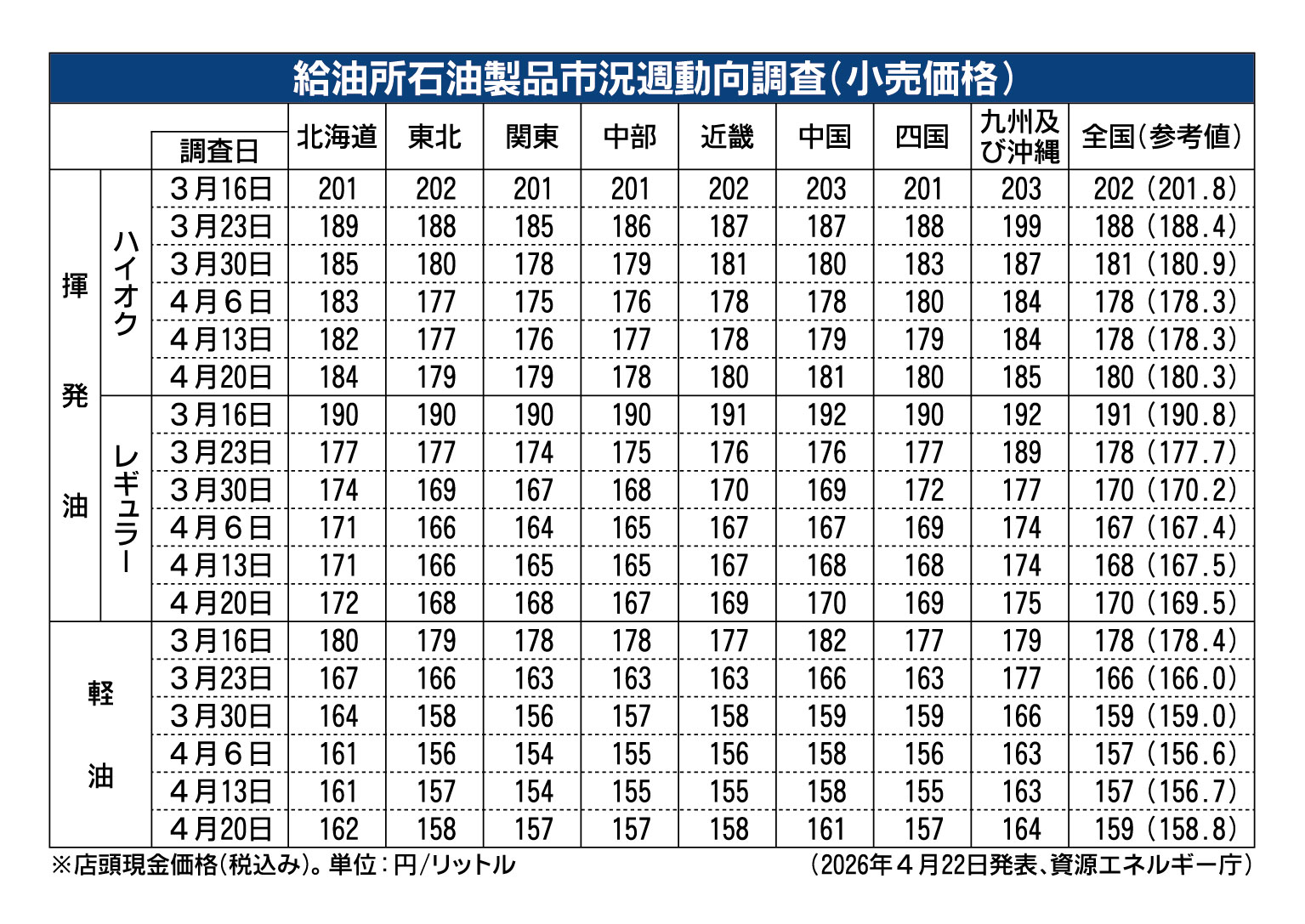 経済産業省が4月22日発表したレギュラーガソリン1リットル当たりの店頭価格(20日時点)は、全国平均で前週比2円高の169円50銭だった。価格を170円程度に調整する政府のガソリン補助金の影響で、2週連続の値上がりとなった。地域別では、44...