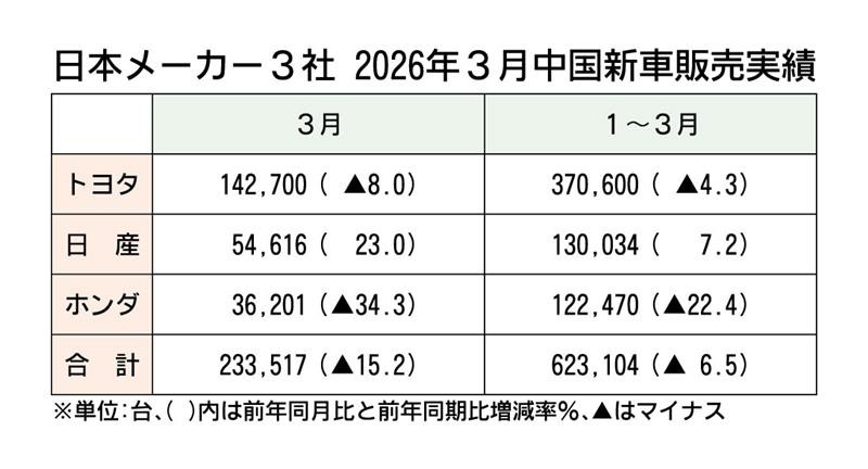 日本メーカー3社の1~3月の中国新車販売は、前年同期比6.5%減の62万3104台だった。日産自動車は同7.2%増と好調だったものの、トヨタ自動車が前年割れとなり、ホンダも同22.4%減と苦しい状況が続く。中国市場全体でも1~3月は同5.6...