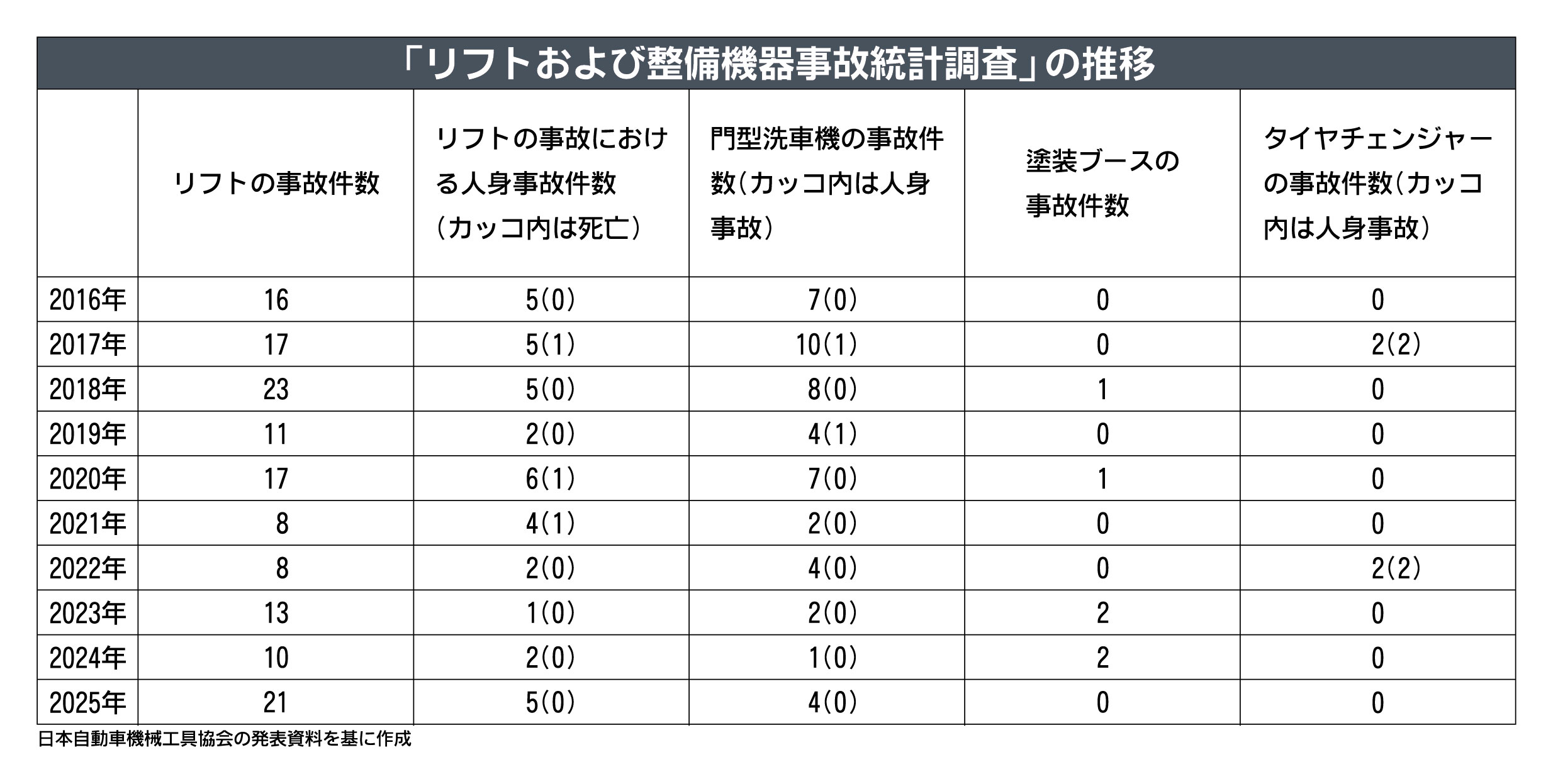 2025年の整備機器事故、前年比倍増 リフトは21件で2018年に次ぐ多さ 機工協調査