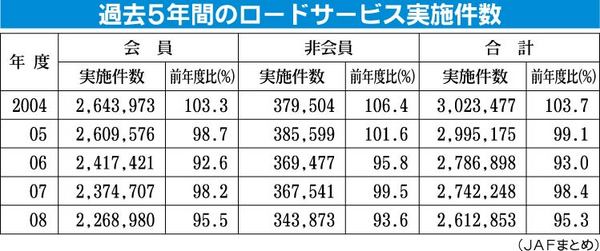 日本自動車連盟(JAF、田中節夫会長)は、2008年度のロードサービス業務量をまとめた。08年度のロードサービス実施件数は、261万2853件で前年度と比較して4.7%減少した。実施件数減少の要因としてJAFは、キーレスエントリー車の普及...