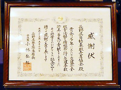 【長野】長野県自動車販売店協会(宇都宮保理事長)は16日、交通事故防止に多大な貢献をしたとして長野県警察本部から感謝状を受けた。同協会の約20年に及ぶ積極的な交通安全教育が認められたもので、宇都宮理事長が小林弘裕県警察本部長から感謝状を直...