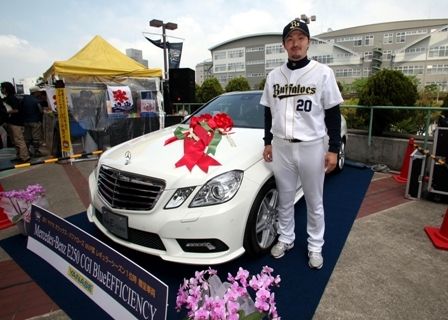 【神戸】ヤナセ(西山俊太郎社長)はこのほど、神戸市須磨区の野球場・ほっともっとフィールド神戸10番ゲート前付近で、「オリックス・バファローズMVP賞」の披露イベントを行った。パ・リーグ優勝した場合、表彰対象球団の受賞選手に贈られる「メルセ...