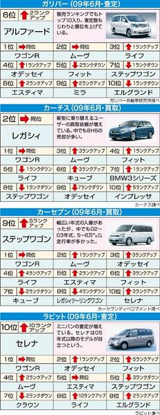 ガリバー自動車研究所、カーチス、カーセブンディベロプメント、ラビットがまとめた2009年6月の中古車査定、買い取りランキングでは、ミニバンのランクアップが目立った。各社合計で延べ16車種がランクイン。うち10車種が順位を上げた。ガリバーと...
