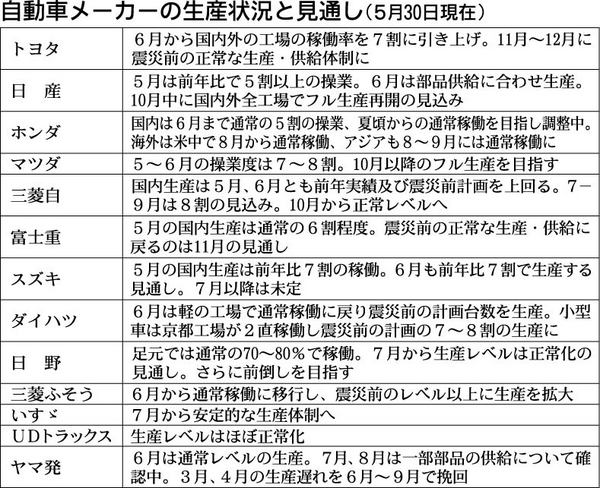 自動車メーカーの国内生産が4月を底に回復していく見通しが見えてきた。全ての車種や仕様が通常の納期で供給できる震災前の状態に戻るのにはまだ時間がかかるものの、生産台数の水準自体は夏を境にして通常レベルを確保できるようになる見込みだ。 5月2...