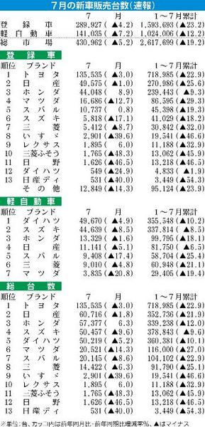 日本自動車販売協会連合会(自販連、天野洋一会長)と全国軽自動車協会連合会(全軽自協、小谷忠幸会長)が3日発表した7月の新車販売(速報値)は43万962台(前年同月比5.2%減)と、昨年10月以来、9カ月ぶりに2けた減を脱した。3ナンバーの...