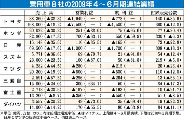 乗用車メーカーの2009年4~6月期業績が4日、出揃った。連結営業損益の合算は2286億円の赤字となり、世界同時不況の真っ只中で急激な減産を行った09年1~3月期の1兆2821億円の赤字に比べて改善した。1~3月期はスズキを除き全社が赤字...