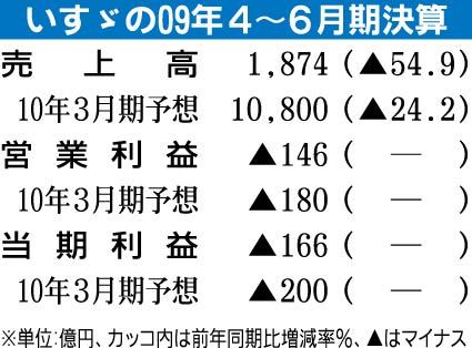 いすゞ自動車が4日発表した2009年4~6月期連結業績は、営業損益が前年同期に比べ349億円減少し146億円の赤字となった。四半期ベースで3期連続赤字。国内需要が当初計画に比べ大幅に落ち込んだほか、アジアや中近東地域での販売減などが響いた...