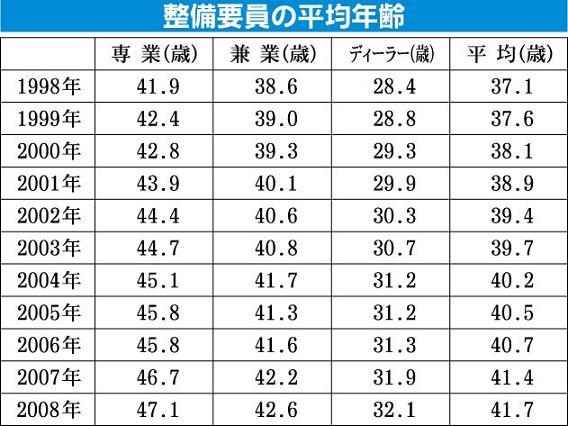 整備要員の高齢化が加速している。国土交通省がまとめた2008年度「自動車分解整備業実態調査」によると、専業、兼業、ディーラーにおける整備要員の平均年齢は41・7歳となり、昨年度から0・3歳上昇した。少子高齢化の影響が顕著に現れており「若年...