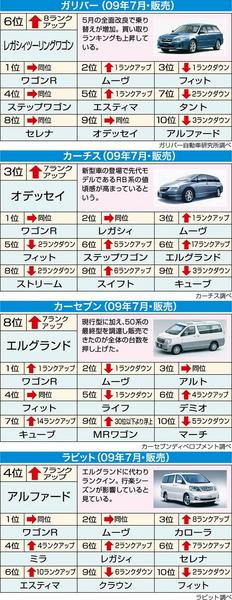 ガリバー自動車研究所、カーチス、カーセブンディベロプメント、ラビットが調べた2009年7月の中古車販売ランキングがまとまった。6月に引き続き、行楽シーズンの影響でミニバンの売れ行きが好調だった。ガリバーでは5車種、カーチスも4車種がトップ...