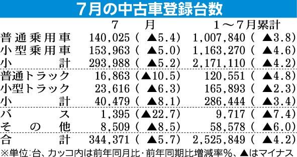 日本自動車販売協会連合会(自販連、天野洋一会長)が12日に発表した7月の中古車登録台数は、前年同月比5・7%減の34万4371台となり6カ月連続で減少した。7月単月としては1979年以来30年ぶりの低水準。ピーク時の96年と比べると約3割...