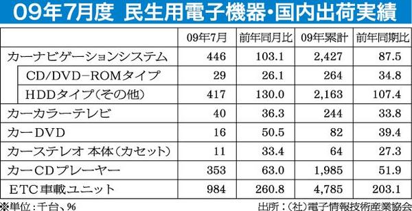 電子情報技術産業協会(JEITA)は26日、2009年7月度民生用電子機器の国内出荷実績を発表した。ETC車載ユニットが前年比2.6倍の大幅増になったことに加え、カーナビゲーションシステムも2カ月連続のプラスになった。ETC特需がカーナビ...