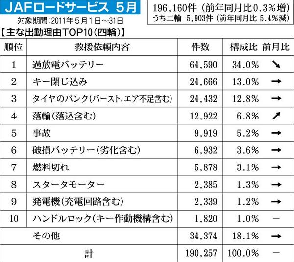日本自動車連盟(JAF、田中節夫会長)がまとめた5月のロードサービス(RS)実施状況は、総実施件数が前年同月比0・3%増の19万6160件となった。大型連休中の救援件数は、震災による自粛ムードなどもあり前年を下回ったが、トータルでは増加し...