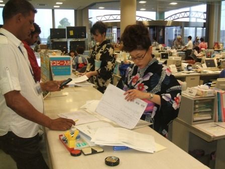 ○…浴衣姿でカウンター越しに会員と書類のやり取りをするのはJU愛知の女性職員。7日の「開場13周年記念ジャンボオークション(AA)の一こまだ。梅雨明けを前に夏本番を思わせる高い気温が続く中、七夕の開催ということで、女性職員がAA会場を訪れ...