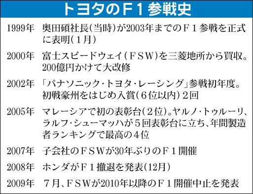 トヨタ自動車が4日、東京本社で開いたF1撤退会見における質疑応答は次の通り。 ―撤退に至った理由は。2012年まで参戦を続けるとしてきたがこの時期に撤退する理由は 豊田章男社長「私自身モータースポーツを推進している。自動車文化にしたいと思...