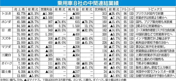 乗用車メーカー8社の2009年9月中間業績と10年3月通期業績見通しが5日、出そろった。各国政府の景気刺激策の効果もあり想定より販売が上向いたのを受けて、通期見通しは期初から黒字予想の三菱自動車を除き全社が上方修正した。ホンダ、スズキは利...