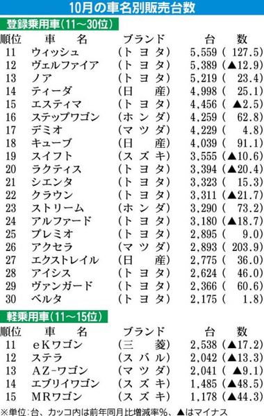 10月登録車車名別販売、プリウス首位6カ月連続―HV比率上昇続く