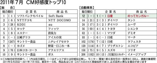 バナナマン登場でシリーズ最高位 CM総合研究所(関根建男代表)がまとめた7月のCM好感度ランキングは、3カ月連続総合首位のソフトバンクモバイルに続いて、NTTドコモ、KDDIと携帯電話3社が上位を独占した。自動車関係では日産自動車のキャン...