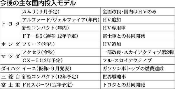 自動車メーカー各社は、独自の環境技術を盛り込んだ低燃費戦略車の市場投入を加速させている。ダイハツ工業は9月に、ガソリンエンジンで燃費30キロメートル/リットル(JC08モード)を達成する軽自動車「イース(仮称)」を発表予定。トヨタ自動車や...