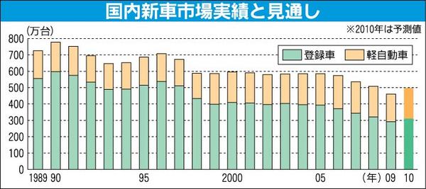 2009年の国内新車販売は、登録車と軽自動車の合計で460万9255台と前年を9・3%下回り、5年連続で減少した。年間新車販売台数が500万台を下回るのは1978年以来31年ぶり。登録車は292万1085台で前年比9・1%減、軽自動車は1...