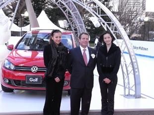 ○…2人の美女に挟まれたのはフォルクスワーゲングループジャパン(VGJ)のゲラシモス・ドリザス社長。5日から東京都心にオープンした都内最大級の屋外アイススケートリンク「フォルクスワーゲン・スケートリンク・イン・東京ミッドタウン」の開所式で...