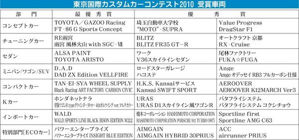 コンセプトカー部門は「FT―86」―。東京オートサロン2010 with NAPACの目玉企画である「東京国際カスタムカーコンテスト」の受賞車が17日に発表された。今回は特別賞として「エコカー部門」が設けられ、全8部門で最優秀賞1台と優秀...