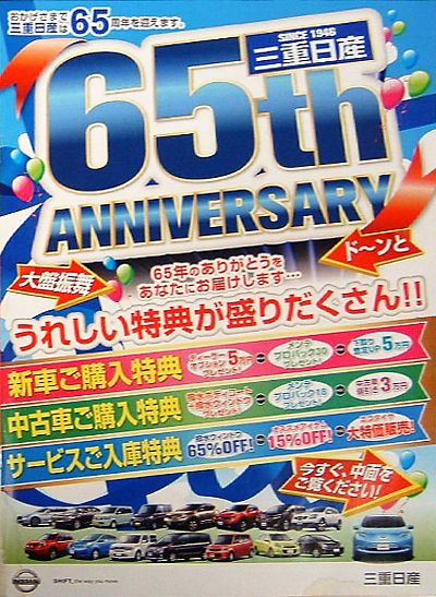 【津】三重日産(岩井純朗社長)は創立65周年の感謝キャンペーンを展開し、新車・中古車拡販とサービス入庫促進を図る。新車・中古車購入客を対象に、オイル交換や法定点検を受けられる「メンテプロパック」などを成約特典とし、さらに中古車値引きや下取...