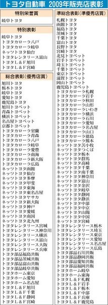 トヨタ自動車は26日に名古屋市内で開催した代表者会議で、2009年に優秀な実績を残したディーラーを表彰、岐阜トヨタ(加藤元康社長)が特別栄誉賞を獲得した。特別表彰は同社のほか、トヨタカローラ八戸(塚原安雅社長)とトヨタカローラ岐阜(三宅敏...