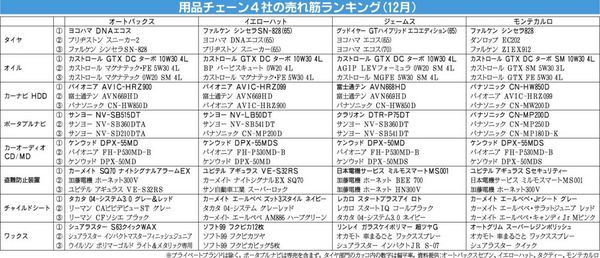 タイヤ部門ではヨコハマDNAエコス、ブリヂストンのスニーカー2、ファルケン シンセラSN―828が依然好調。 オイルはカストロールがオートバックス、モンテカルロで上位3位を独占している。ジェームスの2位にAGIP LEVフォーミュラが登場...